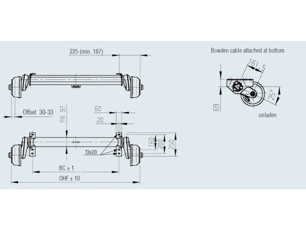 Náprava je dodávána bez lanovodů a kolových šroubů.