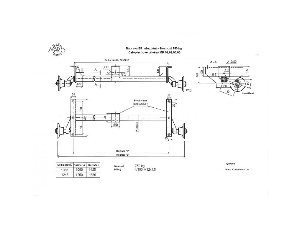 Tato nebrzděná náprava MARO E5 s nosností 750 kg je určena pro plechové přívěsy MARO s rourovou ojí. Náprava je konstrukčně vyvinuta a vyráběna společností MARO Kralovice s.r.o., tradičním českým výrobcem přívěsných vozíků a náhradních dílů.