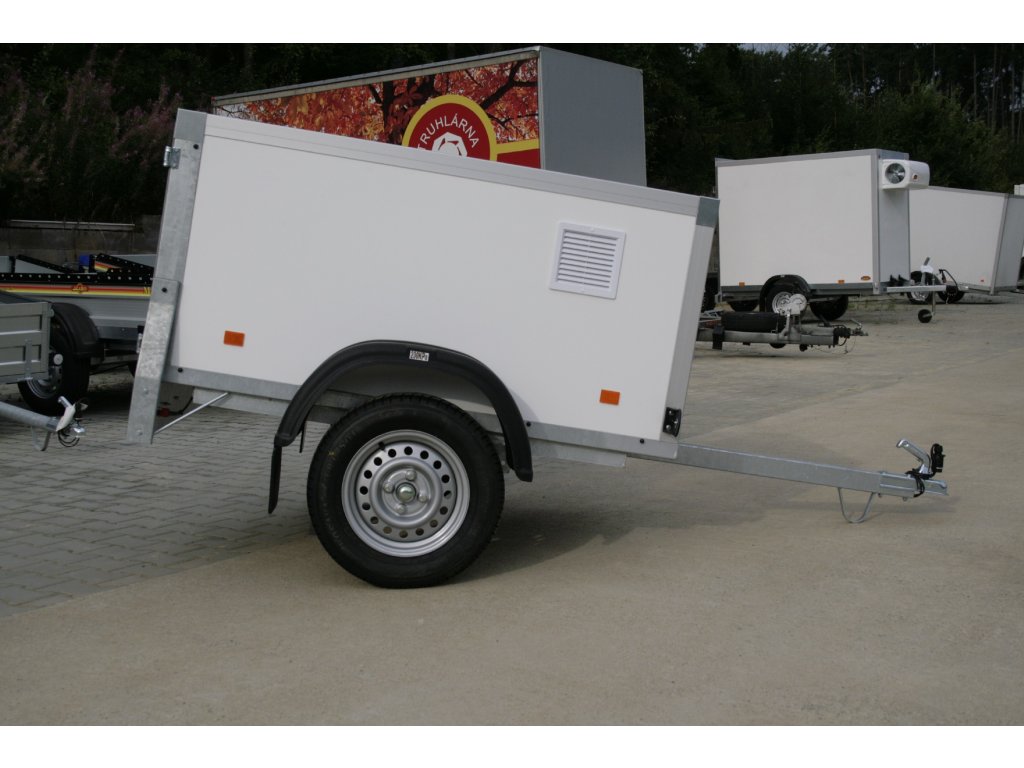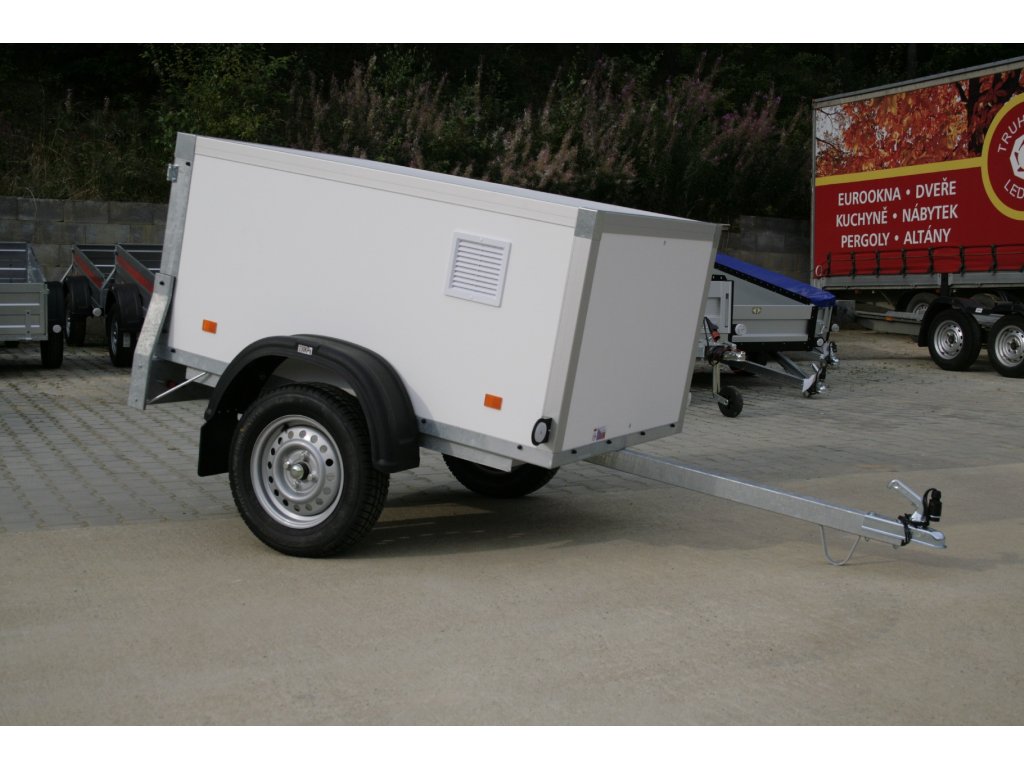 Přívěs pro přepravu psů (2 kotce). Nástavba izolovaná. Zadní dveře jsou uzamykatelné, před dveřmi jsou ještě druhé mřížové dveře Barva přívěsu bílá, stěny jsou i z vnitřní strany velmi snadno omyvatelné.