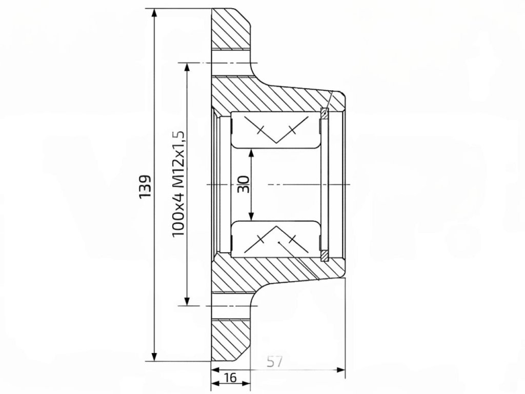 Originální náboj AL-KO určený pro nebrzděné nápravy typu AL-KO 700-5 (ETI číslo 811676). Náboj je opatřen čtyřděrovým uchycením kol s roztečí 100×4 a kolovými šrouby M12×1,5.
