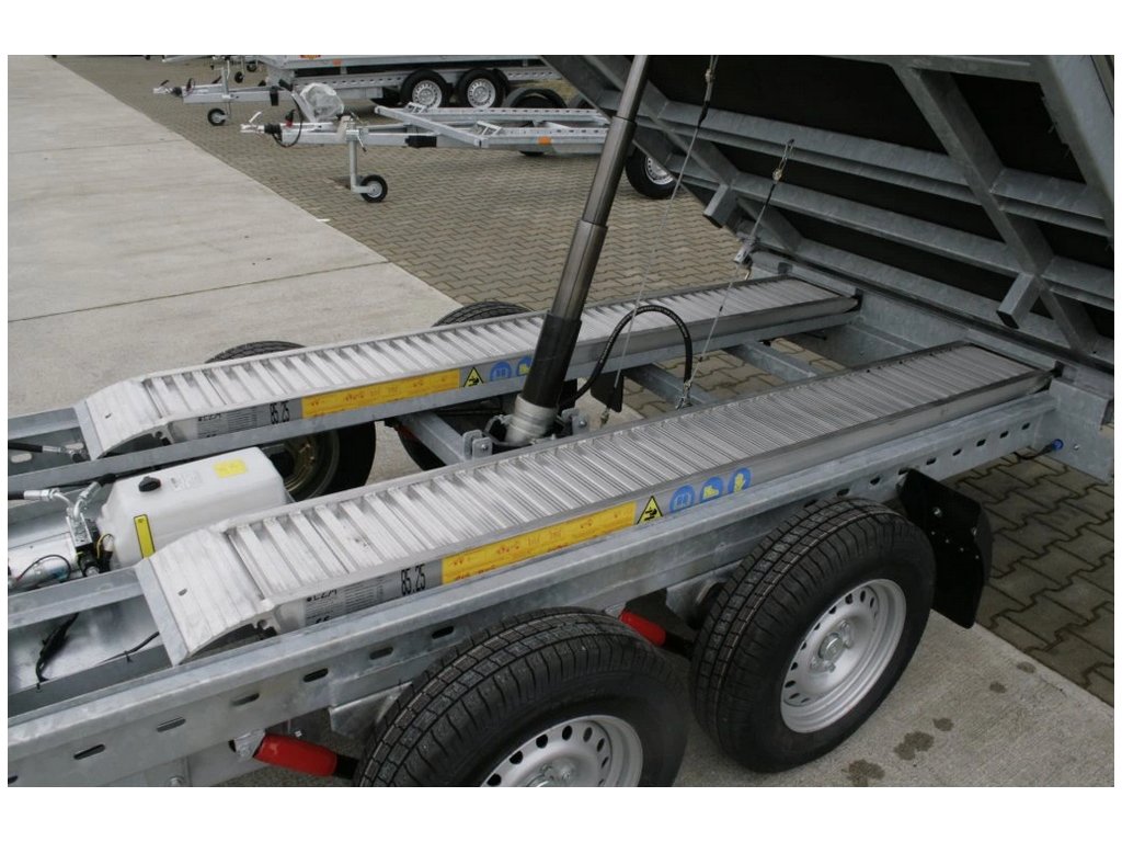Robustní dvounápravový brzděný přívěs z profi řady s koly vedle ložné plochy a hydraulickým sklápěním korby pomocí ruční pumpy. Díky pevné konstrukci, stavebnicovému systému bočnic a osazené síťové nástavbě je TIPPER 1 ideálním pomocníkem pro přepravu sypkých nebo objemných materiálů – ve stavebnictví, zemědělství, komunálních službách i soukromém použití.
