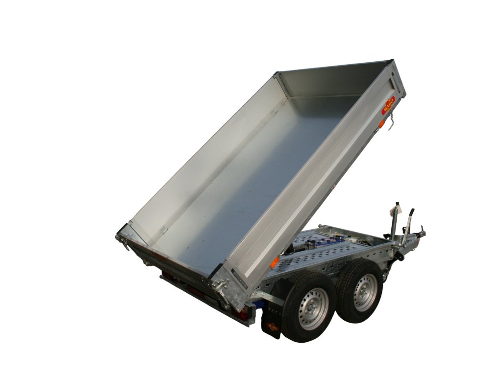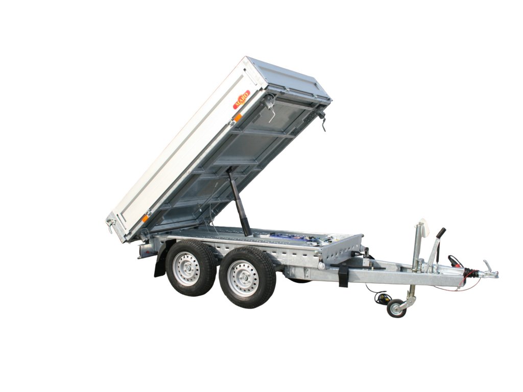 Robustní dvounápravový brzděný přívěs s koly vedle ložné plochy. Sklápění korby probíhá hydraulicky na jednu stranu pomocí ruční pumpy. Vhodný pro přepravu stavebního a sypkého materiálu, pro firmy i náročné soukromé uživatele. Přívěs lze také vyrobit s elektrickým ručním sklápěním