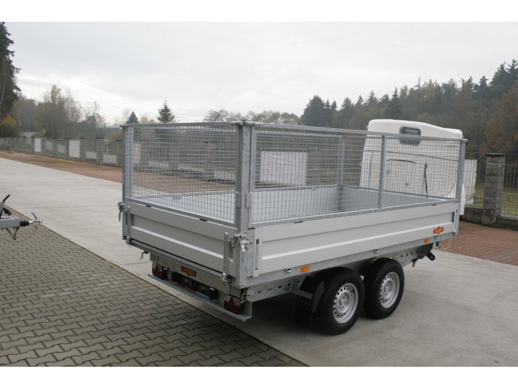 Třístranný sklápěcí přívěs TIPPER 2 B2 2700 kg 3300x1760x1350 mm, elektrická pumpa a síťová nástava 1000 mm