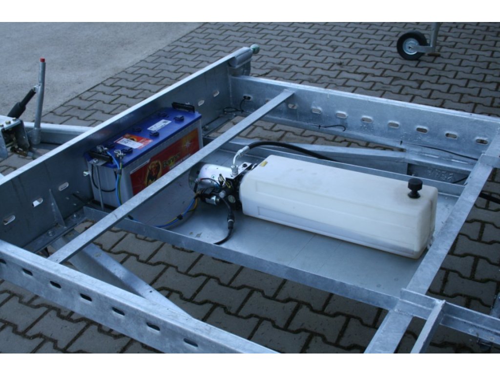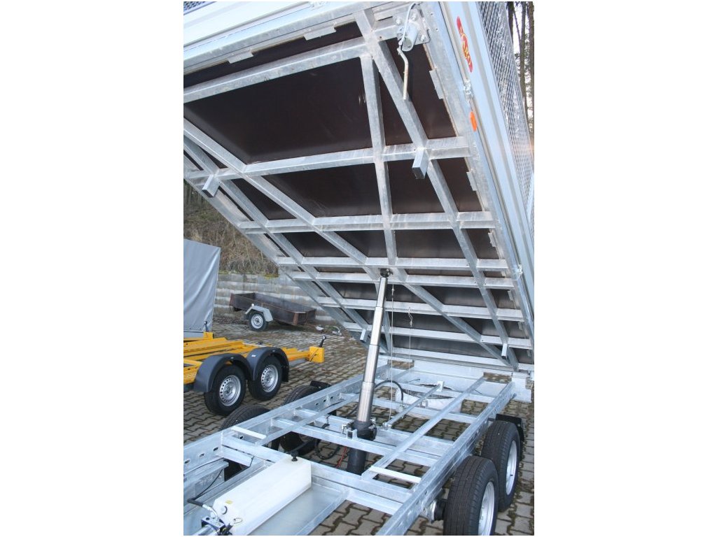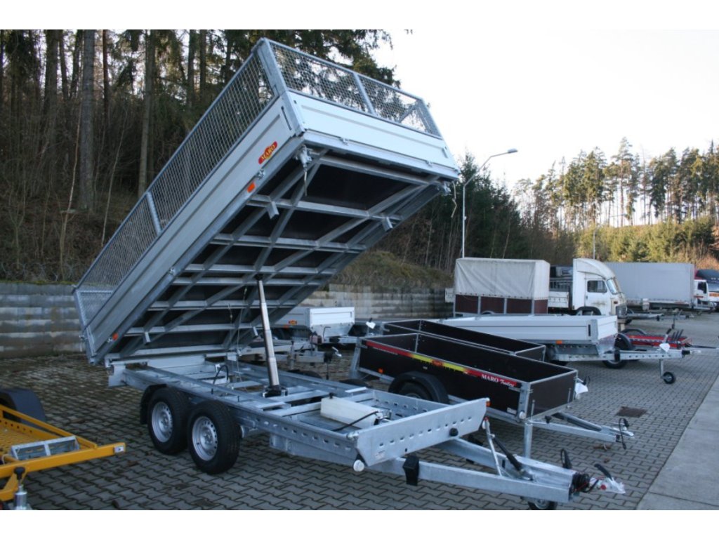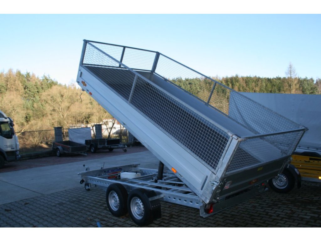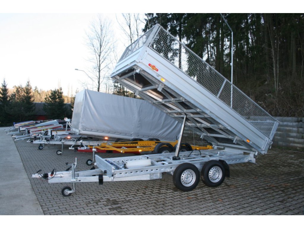 Třístranný sklápěcí přívěs TIPPER 3 B2 3500 kg 4100x2100x850 mm, elektrická pumpa a síťová nástava 500 mm
