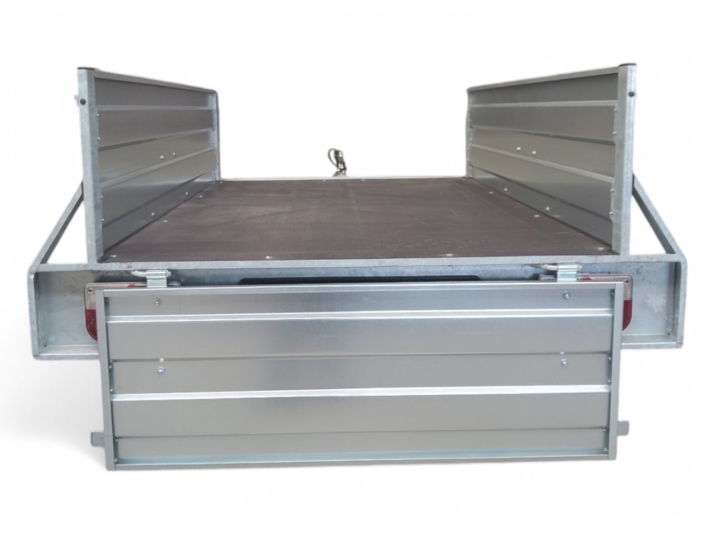 Bočnice přívěsu jsou vyrobeny z pozinkovaného ocelového plechu s prolisováním pro vyšší pevnost a odolnost. Jejich výška 400 mm je nadstandardní oproti běžným přívěsům (300–350 mm), což zajišťuje lepší bezpečnost a větší kapacitu.