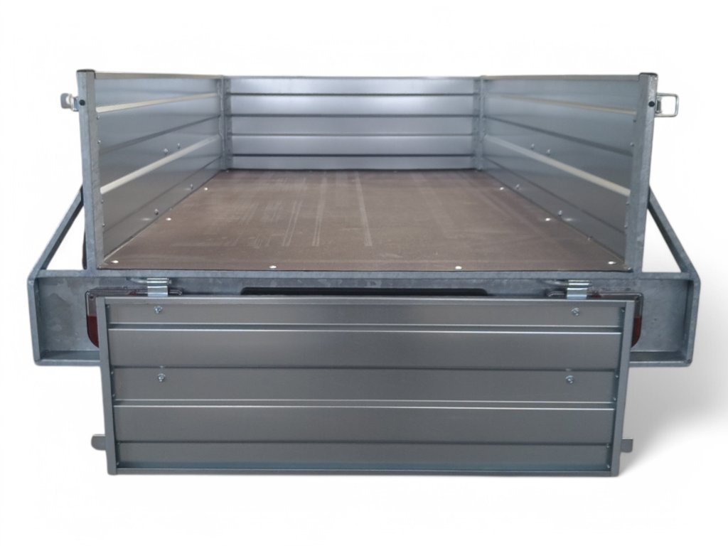 Bočnice přívěsu jsou vyrobeny z pozinkovaného ocelového plechu s prolisováním pro vyšší pevnost a odolnost. Jejich výška 400 mm je nadstandardní oproti běžným přívěsům (300–350 mm), což zajišťuje lepší bezpečnost a větší kapacitu.